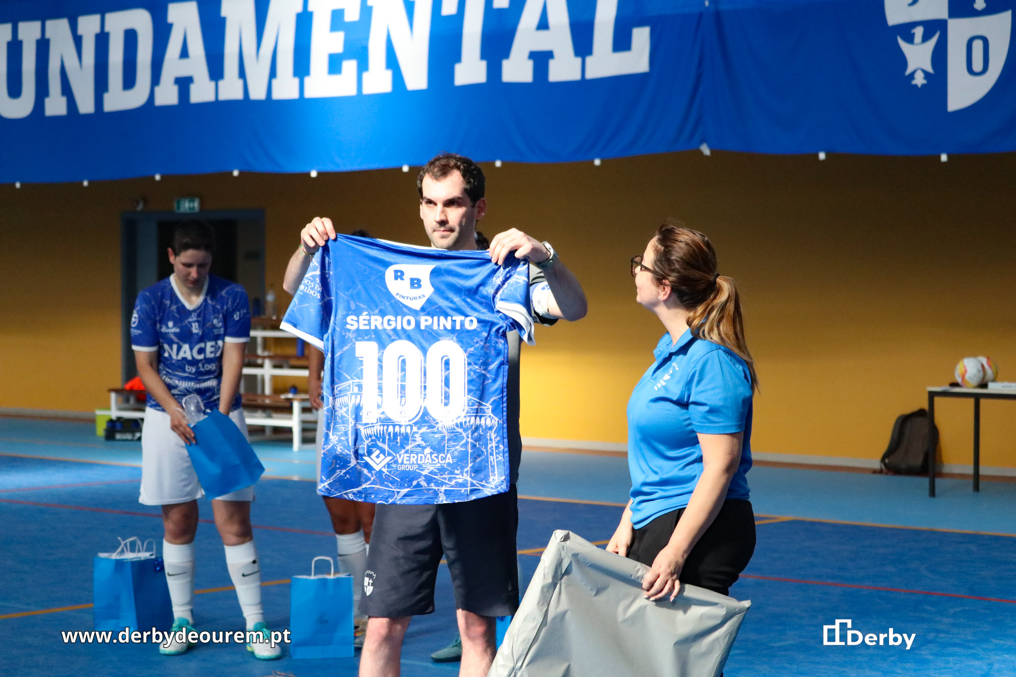 A capitã Ana Rita Marques e as companheiras Rita Santos e Ana Lúcia Reis também tiveram direito à respetiva camisola do centenário, entregue em mãos por Rute Mazza, vice-presidente da JO e diretora do futsal, acompanhada nesta cerimónia informal pelo presidente Renato Lopes.